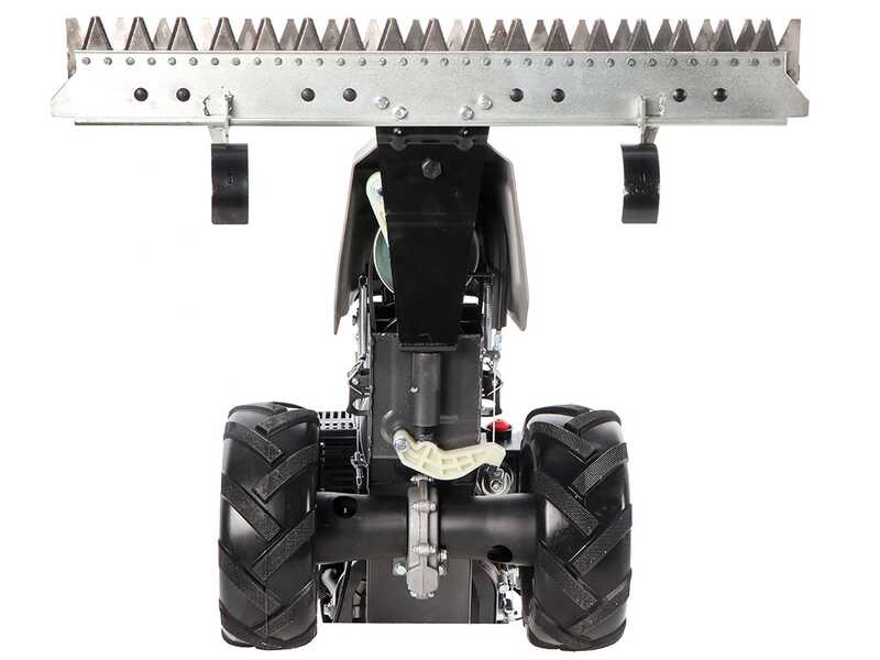 La barra de corte de 88 cm(suministrada) es del tipo mulching con movimiento estándar de una sola cuchilla; esto significa que tiene una eficiencia de corte muy alta gracias a su forma especial, al afilado de las cuchillas y al movimiento estándar de una sola cuchilla. La barra de corte cuenta con dos cuchillas de corte, una inferior y una superior, y esta última está controlada por la transmisión con un movimiento basculante que corta la hierba gracias a la contracuchilla.