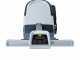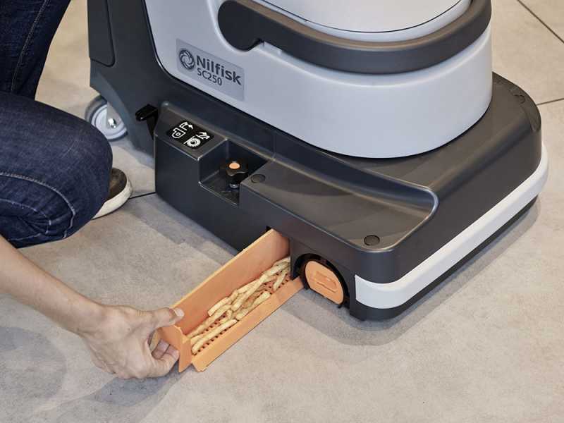 La peculiaridad de esta máquina es que, pulsando la palanca naranja en el manillar, es posible levantar el squeegee delantero para un mejor rendimiento y para recoger incluso los residuos más grandes, que se recolectan incluso en el depósito naranja, fácil de quitar y de limpiar.