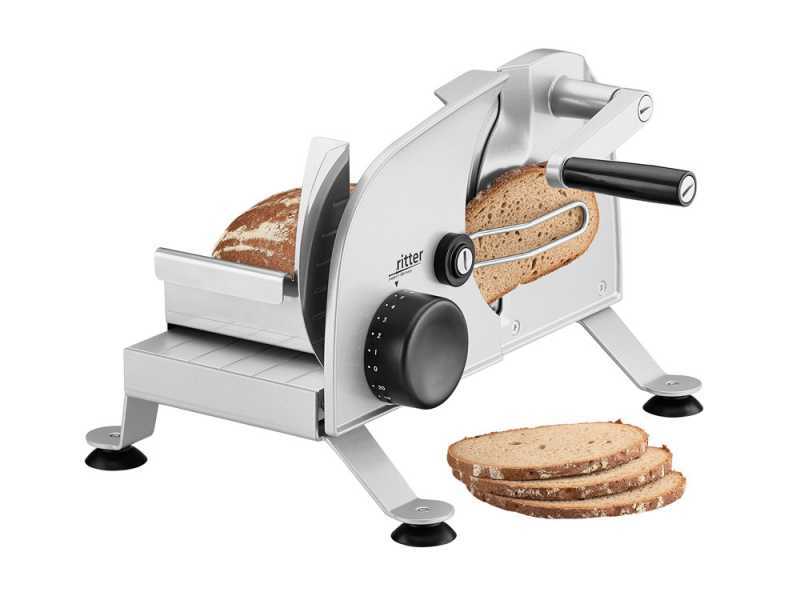 La robusta y deslizante manivela manual se acciona con la mano derecha, mientras que el carro, que incluye la comida a cortar, se conduce con la izquierda.